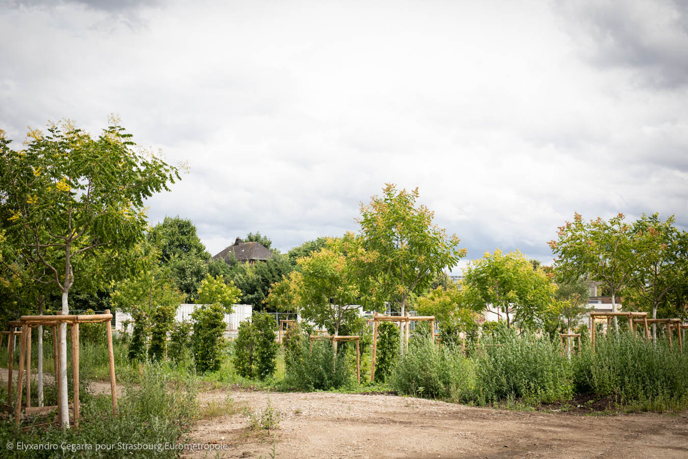 Quartier d’avenir, Archipel 2 l’est aussi par sa dimension environnementale décuplée. S’appuyant sur l’emprise de l’ancien glacis militaire, « un parc de 4,5 hectares, deux fois plus grand que la surface initiale prévue, précise la maire Jeanne Barseghian, permettra de reconquérir la ceinture verte et de renforcer la biodiversité dans ce secteur urbain » délimité par l’Aar, l’Ill et le canal de la Marne-au-Rhin. Aires de jeux et d’agrès, espaces de détente et de découverte, lieux de rencontre seront progressivement aménagés avec la plantation de plus de 1000 arbres et arbustes. Sans attendre, la végétation a déjà repris ses droits sur une parcelle test où les sols ont été décroûtés dans le cadre de l’étude Perméasol menée avec plusieurs laboratoires de recherche universitaires.