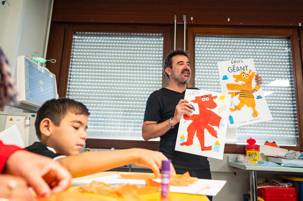 “Je m’appelle Amandine Più, comme un pioupiou !”, lance l’illustratrice. Des sourires se dessinent sur les visages d’Ellana, Gino, Nahil et Lena. Cathéter dans le bras, installés sur quatre lits qui se font face, les enfants qui suivent régulièrement des séances de dialyse assistent ce matin-là à la lecture du conte Georges Géant qu’Amadandine Più a dessiné et que Gilles Baum, professeur des écoles, a imaginé. Georges, c’est ce géant orange sympa, un peu gauche et envahissant qui cherche le métier qui pourrait lui correspondre. Va-t-il y arriver ? Debout derrière une table à roulette sur laquelle ils ont installé un grand tissu noir, l’auteur et l’illustratrice font presque figure de magiciens prêts à faire un tour de magie…. Abracadabra, il était une fois, l’histoire va commencer !