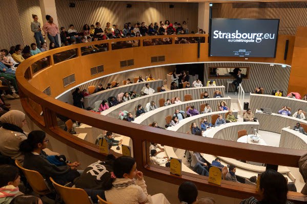 Le parcours de découverte de la citoyenneté, porté par l’association Thémis et soutenu par l’Eurométropole, a invité 10 classes de CM1-CM2 de Strasbourg à rencontrer l’équipe municipale dans ses murs du Centre administratif.