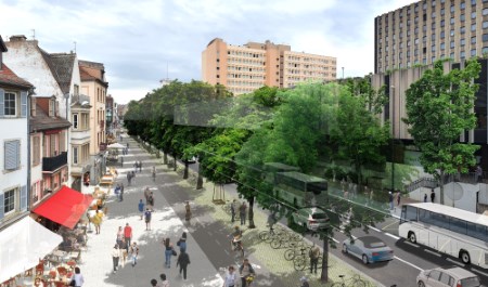 La transformation du secteur des Halles est souhaitée pour répondre conjointement aux enjeux de réinvestissement des espaces publics par la vie locale et aux enjeux métropolitains de mobilité avec le maintien de l’accès au cœur de l’agglomération par les cars express du Réseau Express Métropolitain Européen (cars CTBR) ainsi que des bus urbains (bus CTS).