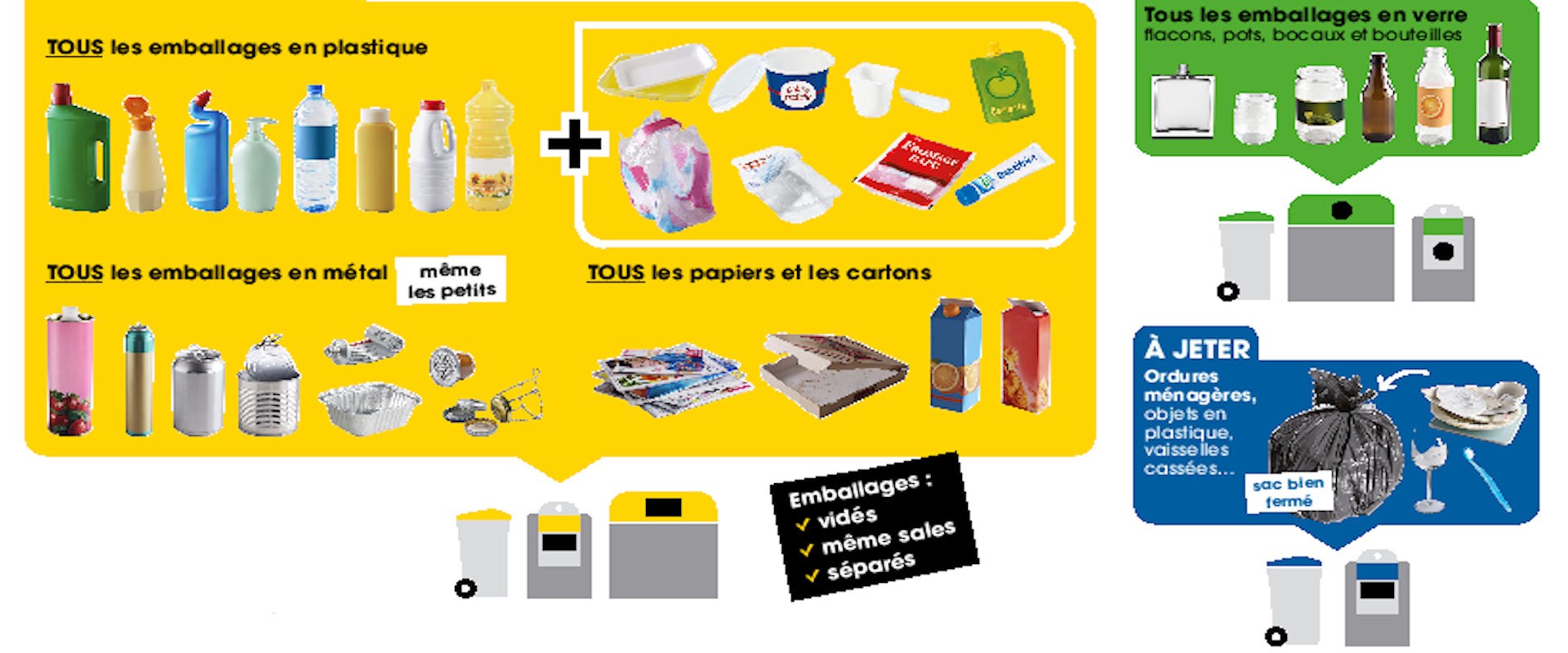 - bac jaune : les déchets sont à jeter en vrac dans le bac sans sac plastique. Respecter les consignes de tri et en cas de doute jeter dans le bac bleu.