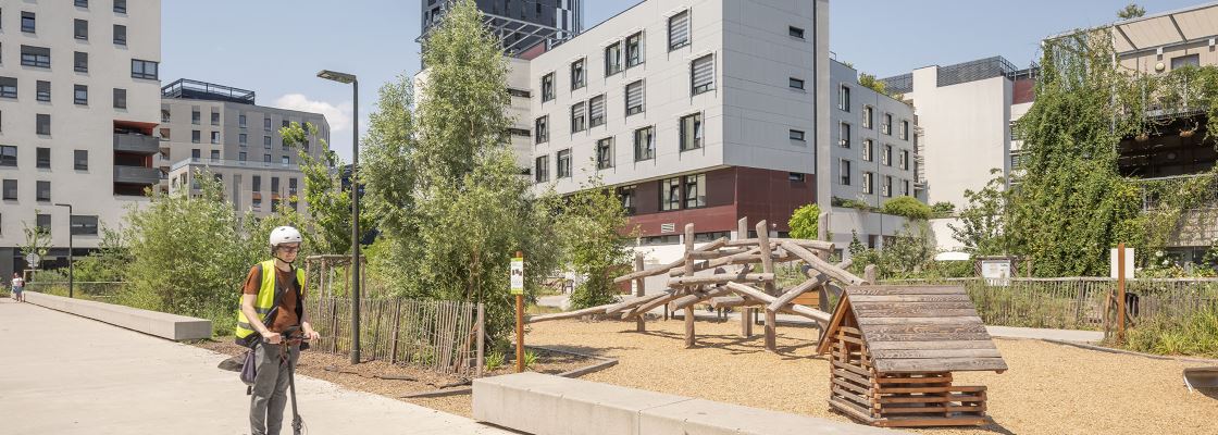 Ces espaces permettent une rencontre entre les différentes générations d’habitant·es et occupant·es du site, notamment au travers de l’école maternelle et de l’EHPAD.