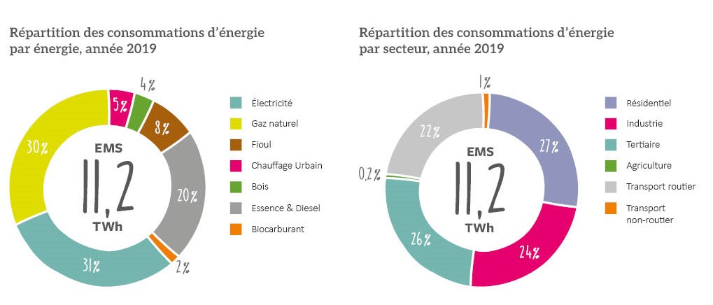 - les émissions de GES représentent 1,7 millions de tonnes CO2équ dont 37% au gaz naturel fossile, 36 % sont liées aux transports et 14% au fioul.