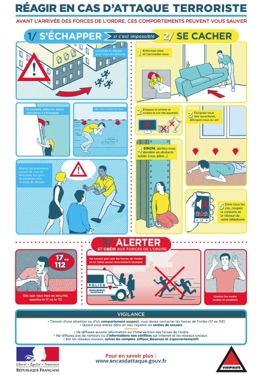 - la communication des instructions pratiques pour se protéger en cas d'attaque,qui s'articulent autour du triptyque "s'échapper, se cacher, alerter".